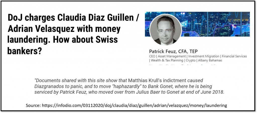 Enter Danilo Diazgranados. Diazgranados owned shell companies associated with the Venezuelan money laundering operation. After Krull’s indictment, in a panicked effort, Diazgranados moved his assets to Gonet bank under the supervision of Patrick Feuz. Feuz and Krull have a long history of working as “bankers” for Venezuelan like Diazgranados. According to the documents, Gonet’s Chief Compliance Officer in the Bahamas reported flaws in Diazgranados’ onboarding process (failure to corroborate source of wealth). Despite this, Diazgranados’ account was approved first by Nicolas Gonet.